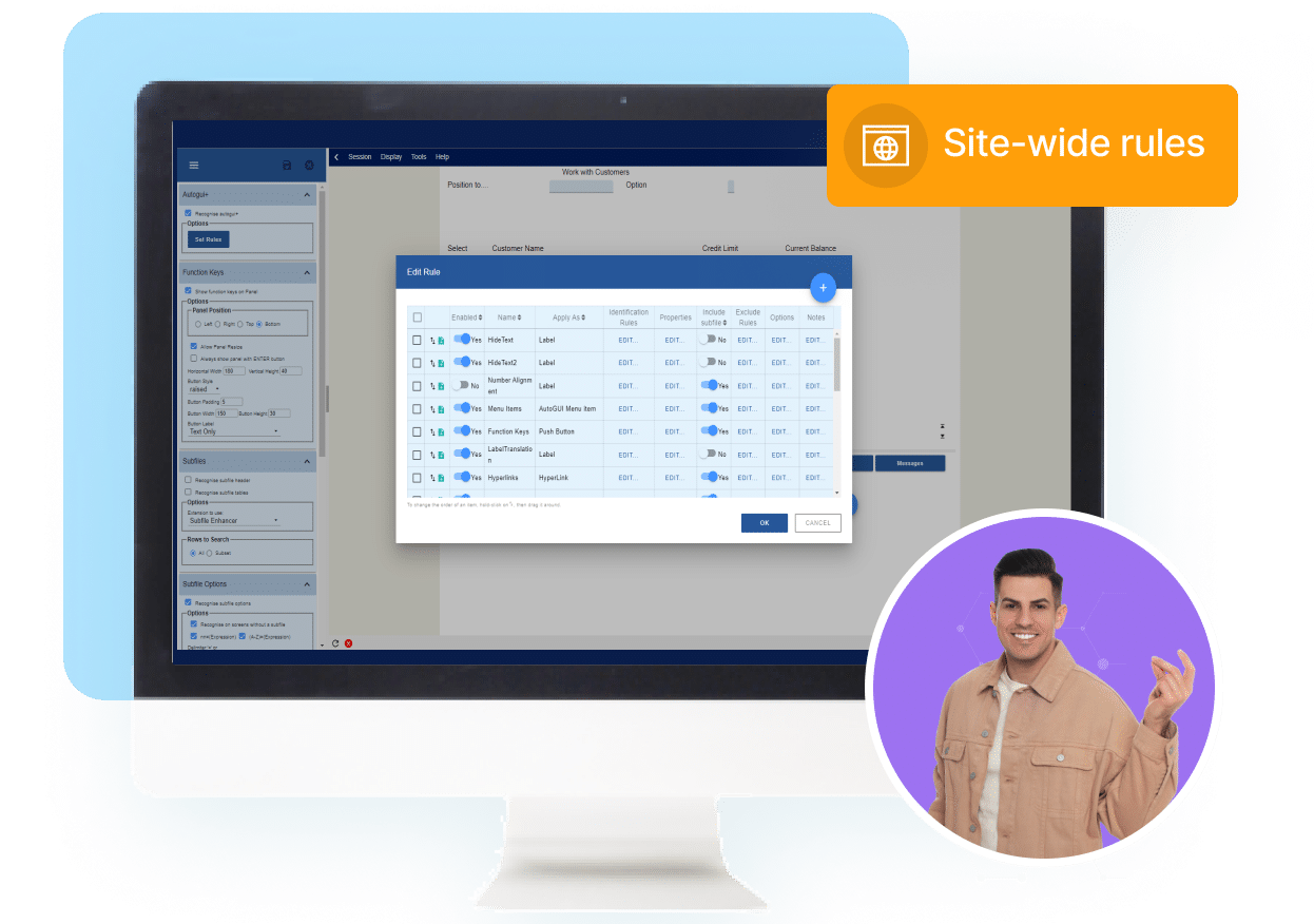 Accelerate modernization by applying the same settings across your application’s pages. aXes enables you to create site-level rules that let you edit the look and feel of your screens further (e.g., button themes, dropdowns).